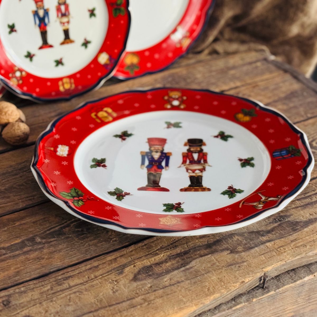 Okrągły półmisek świąteczny o średnicy 32,5 cm to wyjątkowy element świątecznej zastawy, który zachwyca elegancją i bajkowym wzornictwem. Klasyczna czerwień, świąteczne motywy oraz urocze żołnierzyki tworzą na nim niepowtarzalny, bożonarodzeniowy klimat. Idealny do serwowania ciast, owoców lub przekąsek, stanie się ozdobą stołu i podkreśli magię rodzinnych spotkań.